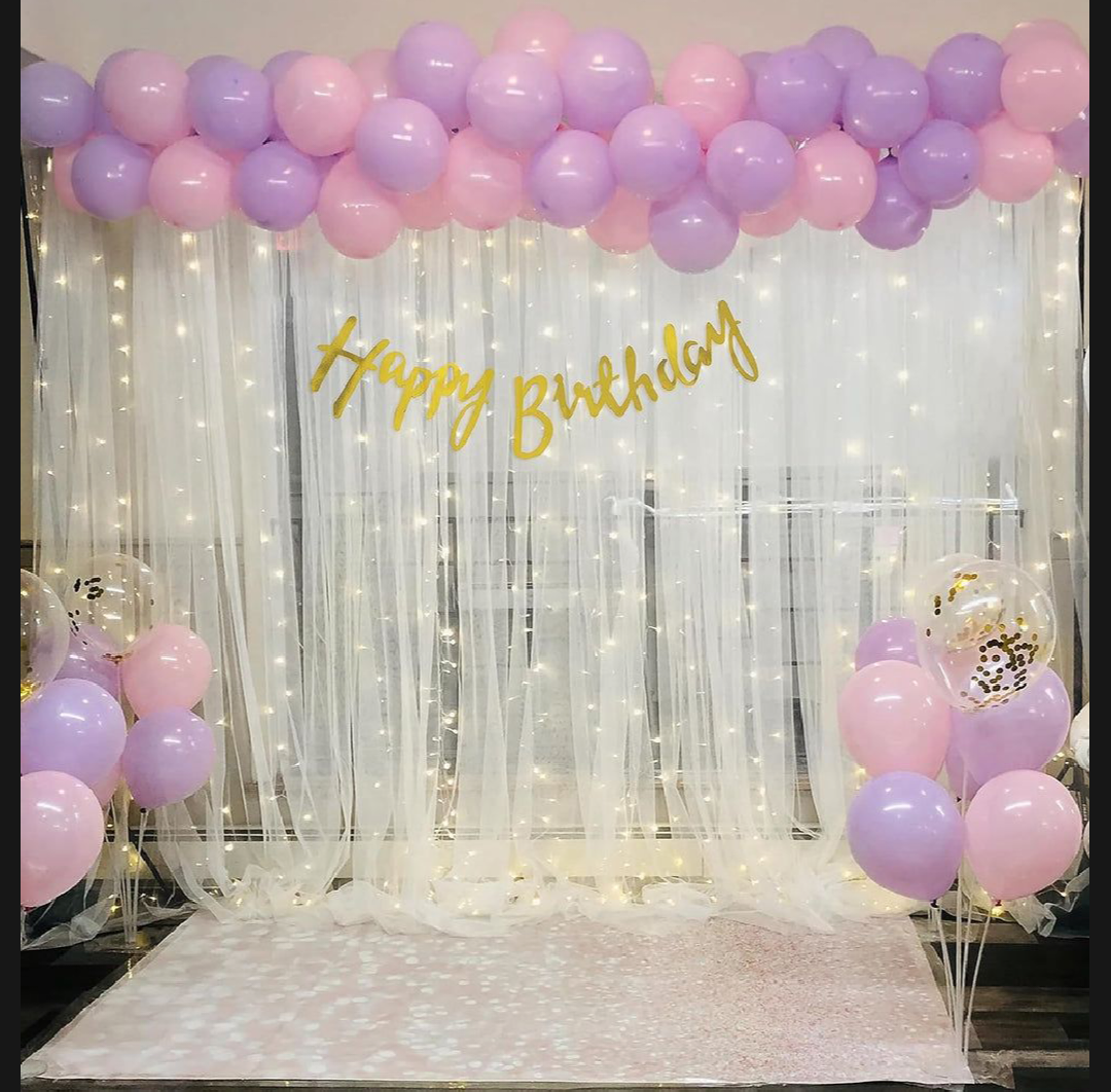 Purple Pink Golden Happy Birthday Theme Set With Net Curtains and Fairy Lights